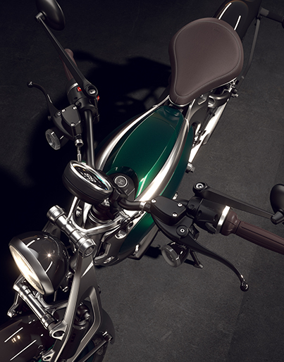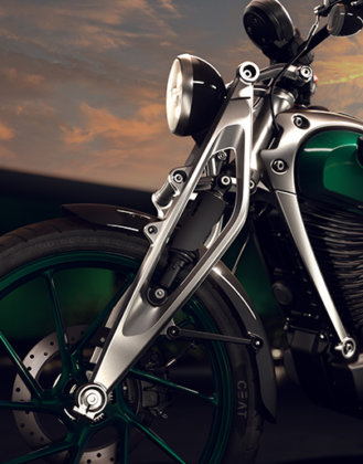 Ia turut menampilkan kerangka terdedah, suspensi depan jenis girder, dan juga pelana terapung.