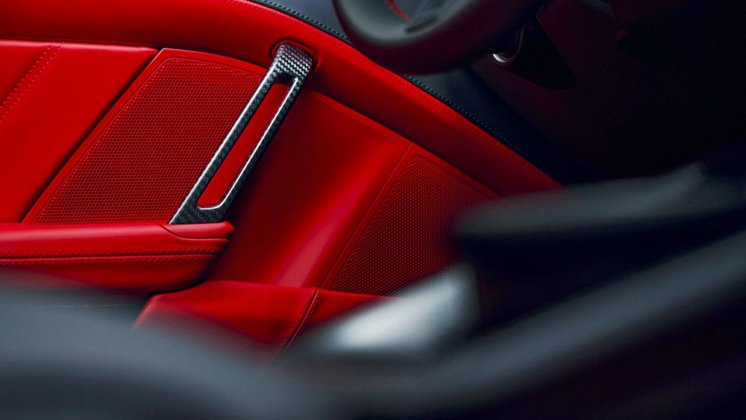 Bahagian dalaman mengekalkan tema ringan dengan penggunaan karpet khas dan panel pintu dengan tali tarikan gentian karbon.
