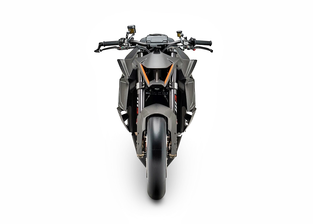 KTM 1390 Super Duke RR Track ini menjalani pengurangan berat ketara melalui penggunaan sejumlah bahan gentian karbon.