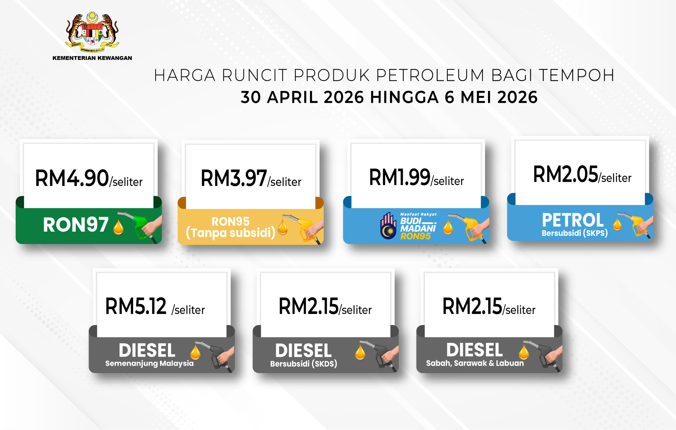 Harga runcit petrol RON95 dan RON97 masing-masing naik sebanyak 10 sen dan 5 sen manakala diesel kekal tiada perubahan bagi tempoh 30 April hingga 6 Mei 2026.