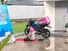 Penunggang Foodpanda dilihat solat di atas lantai perkarangan stesen minyak